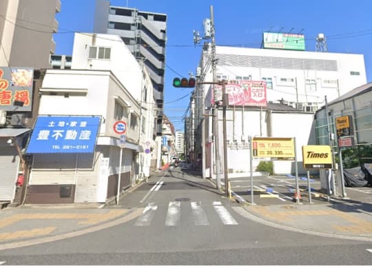 交差点を左に曲がり、まっすぐ歩いていくと、左手に「豊不動産」があります。