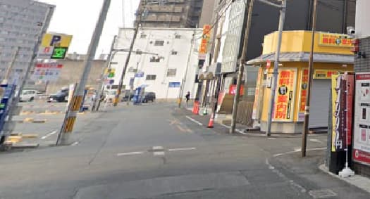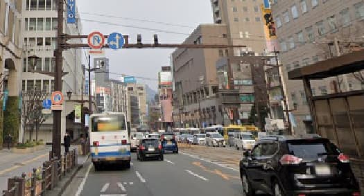 市電の水道町駅から熊本市役所方面へ歩いてから最初の交差点を左折します。